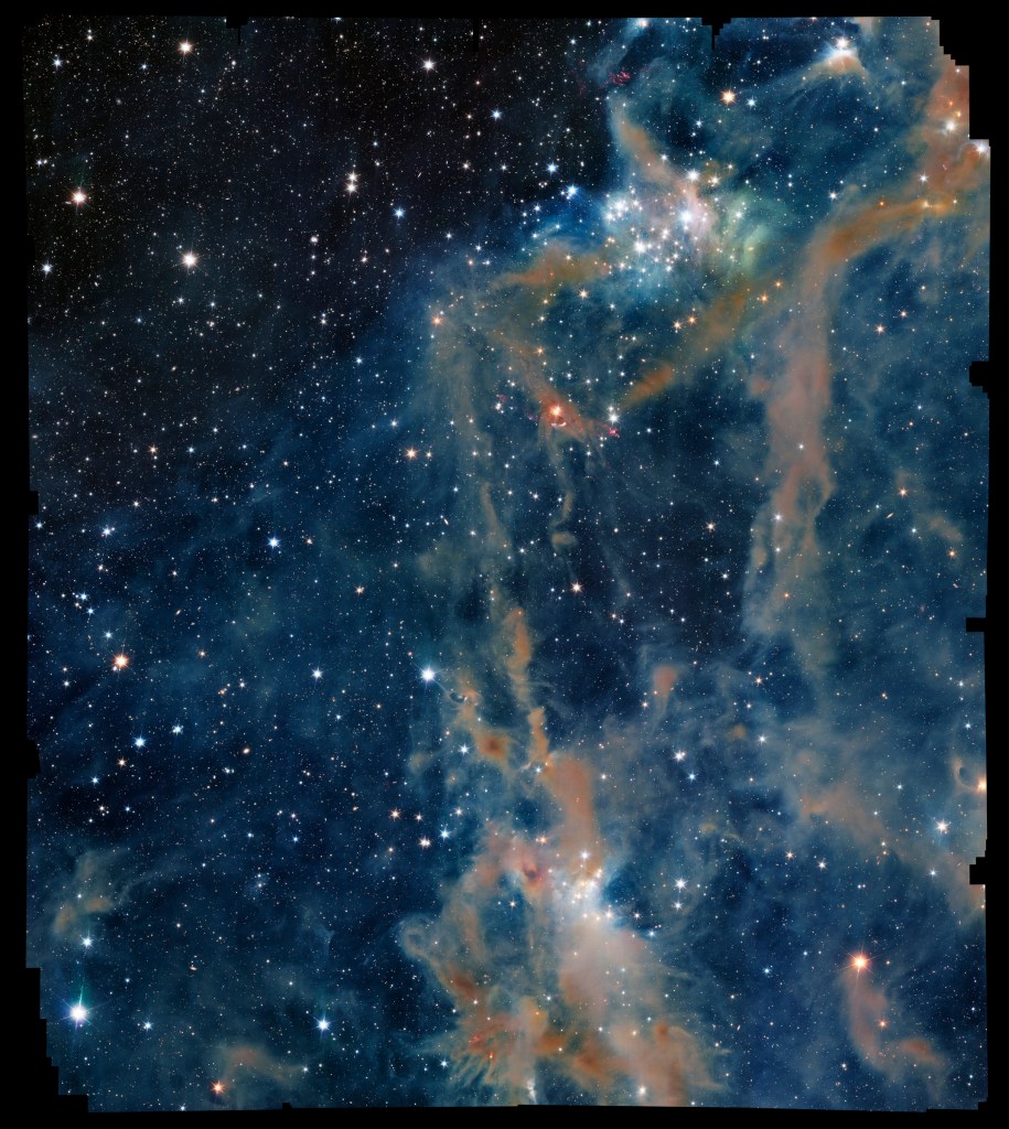The nebula is teeming with very young stars. Some of the objects embedded in the dusty surroundings spew out material – a sign of stars being formed. The outflows appear as magenta-coloured spots and coils when zooming into the image.