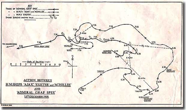What happened thereafter is shown in the map below, taken from the official Admiralty report into the battle. You can see that Harwood attacked from the south, with Exeter initially turning to port while Ajax and Achilles turned starboard. Langsdorff realised the main threat came from Exeter so he concentrated all his main guns on her, leaving his secondary 5.9 inch guns to engage the two lighter cruisers as they used their superior speed to attack from the other side.