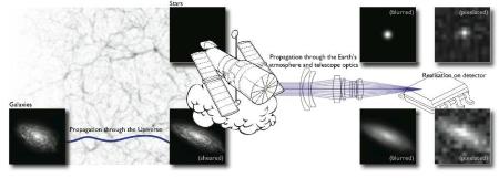 So the image of a galaxy is sheared by the large scale structure, then blurred by the PSF of the atmosphere and telescope, and finally distorted further by being represented by pixels in a camera. Star images are not sheared, but are blurred by the PSF. The challenge is to measure the shear effect (which is small) in the presence of all these other complications.