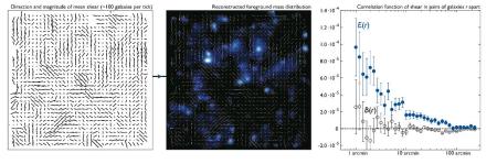 As shown in the Figure (click it for a higher-resolution version), the weak lensing effect varies as a function of position (left; taken from Massey et al. 2007), which can be used to map dark matter (centre) or the correlation function of the shear can be constructed (right; taken from Fu et al. 2008).