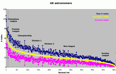 The centrepiece of Paul’s post was the following graph which shows the distribution of two different bibliometric measures for the UK astronomical community. There is the h-index (which is the number h such that the author has h papers cited at least h times) and a normalised version of h in which each paper’s citations are divided by the number of authors of that paper before the index is formed; I call this index hnorm. The results are shown below: