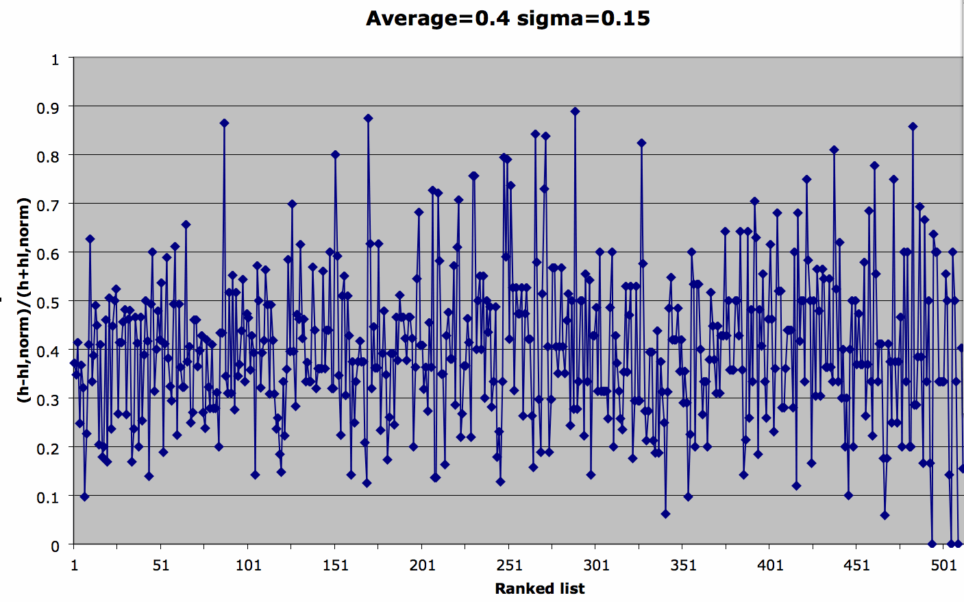 Notice that the “lurker index” is constructed to normalise out any general trend with h and the data do seem consistent with a constant mean across the ranked list. There is, however, a huge spread even among the top performers.