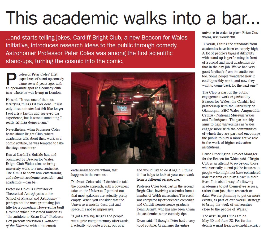 It seems my 12-minute stab at being a comedian at Bright Club Wales has led me to the dizzy heights of fame. So much so that I’ve even appeared in the latest issue of Cardiff University News (which you can read online here). Here’s the piece, though you might need to click on it to make it big enough to read..