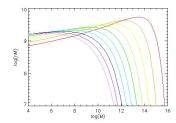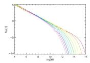 Anyway, courtesy of my estimable PhD student Jo Short, this is how the mass function of haloes is predicted to evolve in the standard cosmological model (the different lines show the distribution as a function of redshift for redshifts from 0 to 9):