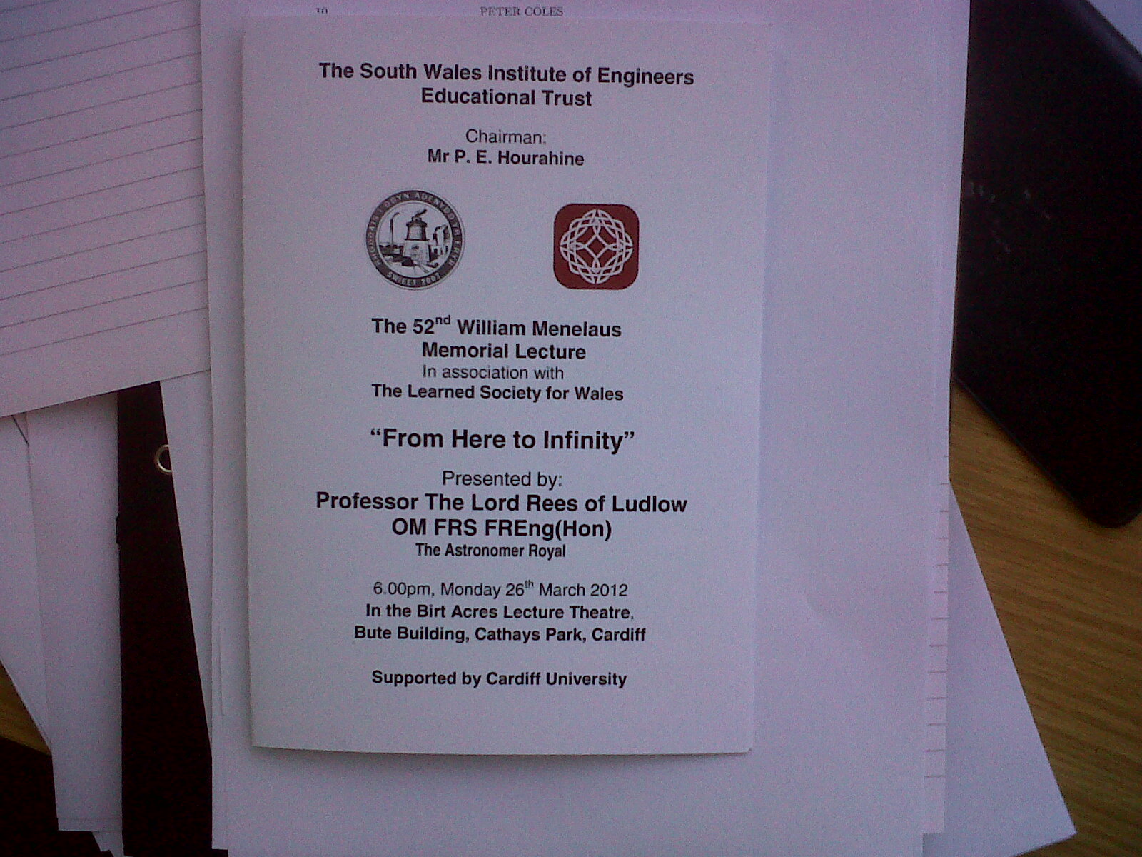 Posted in Biographical, Education, The Universe and Stuff with tags astronomy, Cardiff University, Learned Society for Wales, Lord Rees, Martin Rees, National Astronomy Meeting on March 26, 2012 by telescoperSo the glorious weather continues. Unfortunately, unlike most UK universities, we’re not finished for Easter yet; at Cardiff University we only get three weeks for the Easter recess instead of the four that colleagues over the border seem to enjoy.
