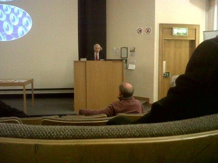 UPDATE: It was indeed a very interesting and entertaining lecture by Lord Rees; here he is, in action, watched by Prof. Disney…