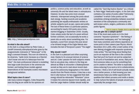 Pure vanity drove me to post this screenshot of a nice write-up of this blog that appears in this month’s Physics World. You can read the whole edition online here if you have a subscription, but if you click on the image it’s more-or-less legible. They’ve written very nice things about In the Dark, so hope I don’t get into trouble with their copyright enforcers by posting this…