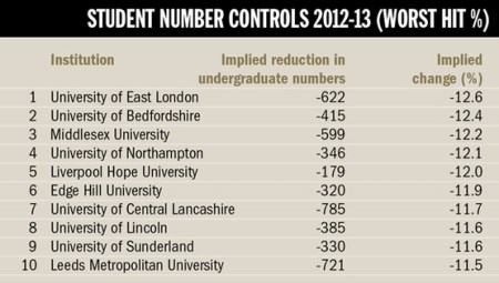 Posted in Education, Finance with tags HEFCE, Higher Education, Universities on March 29, 2012 by telescoperAs reported in the Times Higher , the Higher Education Funding Council for England (HEFCE) has announced its allocations to English Higher Education Institutions for 2012/13. As expected, many universities are receiving substantial cuts next year. Here is a table of the biggest losers: