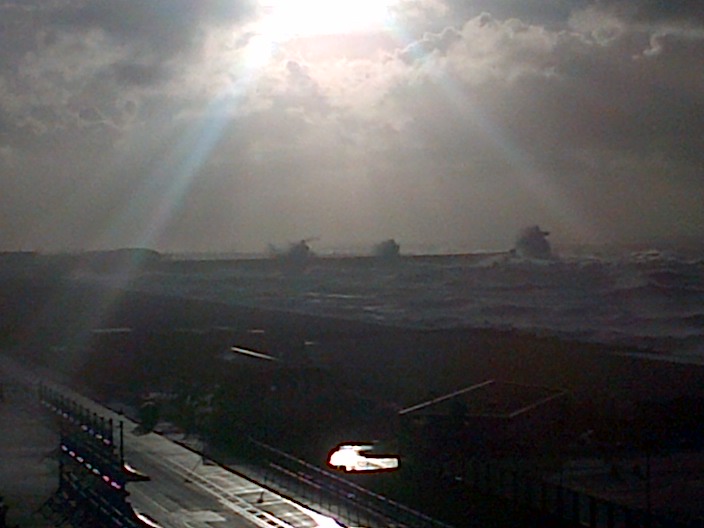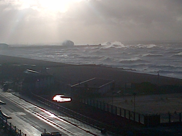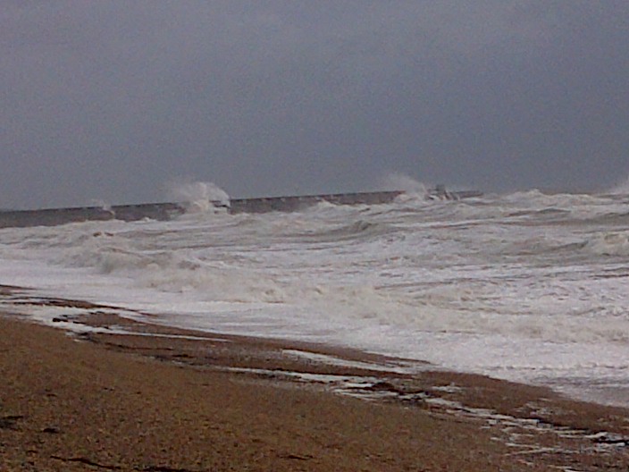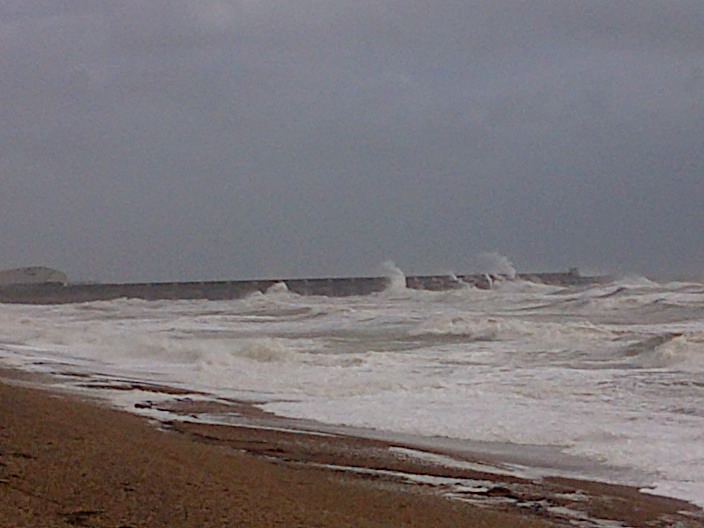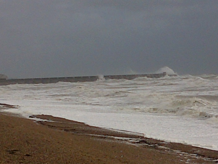 I saw a tweet before I left for work this morning advising folk to avoid Brighton seafront during the storm. That’s a bit difficult when you live on the seafront. Anyway, I did decide to take a short walk along the promenade before returning to my usual route to the bus stop. I managed to take this picture with my Blackberry, the view being eastwards towards Brighton Marina. It was quite difficult to get a picture directly into the sun, but it gives you an idea of the size of the waves crashing against the breakwater.