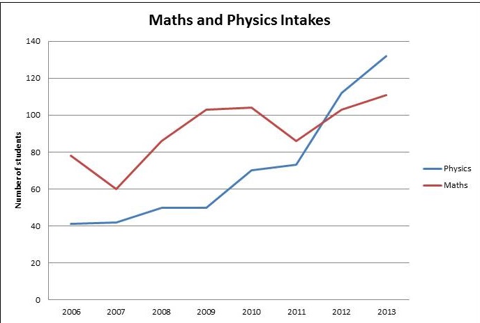This event is something I started thinking about just as soon as I arrived in Sussex in February this year, and we’ve been preparing for it actively for quite a long time. The background to it is that the School has expanded dramatically over the last few years, especially in the Department of Physics & Astronomy. The Department of Mathematics has grown too, but at a more modest rate. Here, for example, is the annual intake of undergraduate students for our two departments over the last few years: