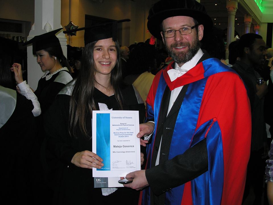 Also graduating with top marks in our MSc in Cosmology was Mateja Gosenca, who is now my PhD student. Here we are at the drinks party after the graduation ceremony; Mateja is looking very happy holding her certificate as winner of the Sir William McCrea Prize for the best student on the MSc programme!
