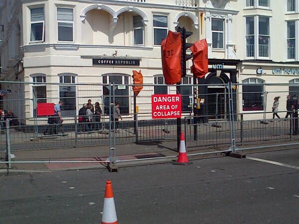 The barricades you see are nothing to do with with subsidence, but are there for tomorrow’s “March for England”, the annual attempt by the gang of Neo-Nazi thugs called the EDL to stir up trouble in Brighton. Presumably the fences are intended to separate the EDL from human beings. The collapsed road was to have been part of the route, but presumably alternative arrangements have been made. I would have preferred the road closure to have been used as an excuse to cancel the march altogether actually. I’d rather have no road at all than one filled with such creatures.