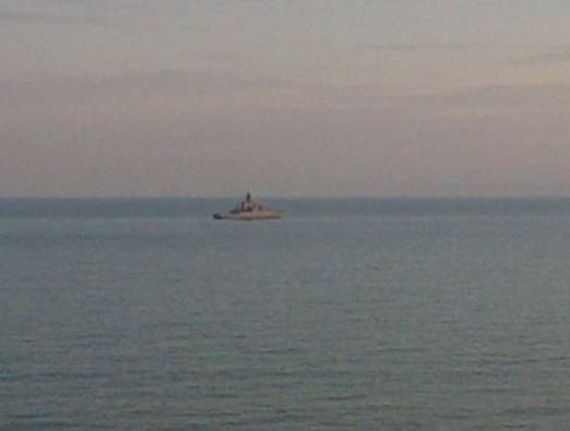 When I was on the way home yesterday evening I was a bit surprised to see a warship, apparently belonging to the Royal Navy, seemingly  at anchor off Brighton beach: