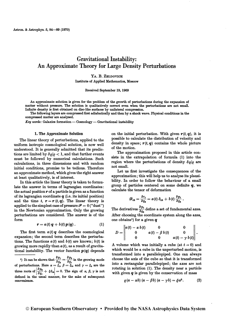 Back to the grind after an enjoyable week in Estonia I find myself with little time to blog, so here’s a cute graphic by way of a postscript to the IAU Symposium on The Zel’dovich Universe. I’ve heard many times about this way of visualizing the Zel’dovich Approximation (published in Zeldovich, Ya.B. 1970, A&A, 5, 84) but this is by far the best graphical realization I have seen. Here’s the first page of the original paper: