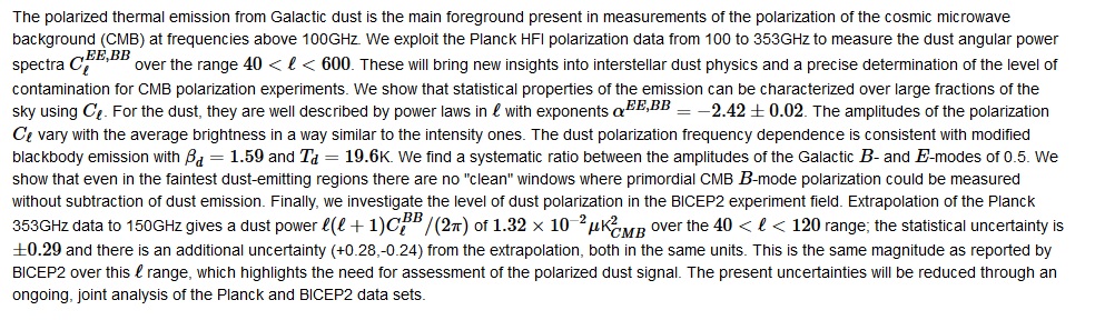 Although it is consistent with being entirely dust, the Planck analysis does not entirely kill off the idea that there might be a primordial contribution to the BICEP2 measurement, which could be of similar amplitude to the dust signal. However, identifying and extracting that signal will require the much more sophisticated joint analysis alluded to in the final sentence of the abstract above. Planck and BICEP2 have differing strengths and weaknesses and a joint analysis will benefit from considerable complementarity. Planck has wider spectral coverage, and has mapped the entire sky; BICEP2 is more sensitive, but works at only one frequency and covers only a relatively small field of view. Between them they may be able to identify an excess source of polarization over and above the foreground, so it is not impossible that there may a gravitational wave component may be isolated. That will be a tough job, however, and there’s by no means any guarantee that it will work. We will just have to wait and see.