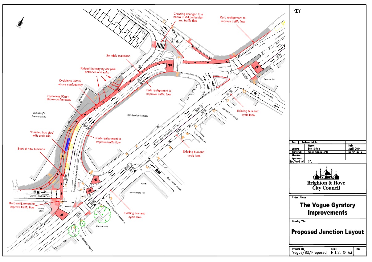 These floating bus stops have been deployed further up the Lewes Road to good effect; cycles pass behind the bus stop so there is no need for them to attempt to overtake buses which have stopped and no need for buses to wait for cyclists passing the stop before pulling in to pick up passengers. The only problem is that pedestrians have to cross the cycle laneto get to the bus stop, and they sometimes do so without paying sufficient attention. There has therefore been an occasional collision between people on foot and people on bikes. Nevertheless these floating stops have largely been successful and I think are a good idea from Brighton and Hove City Council. This is no doubt why they decided to apply the same principle to the bus stop in the Vogue Gyratory.