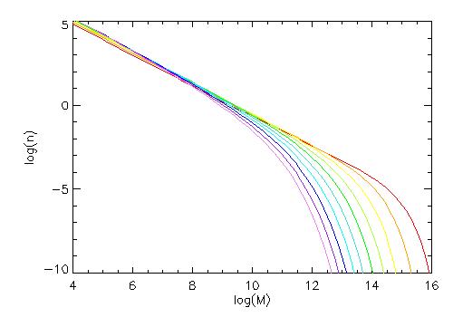 Anyway, this is how the mass function of haloes is predicted to evolve in the standard cosmological model; the different lines show the distribution as a function of redshift for redshifts from 0 (red) to 9 (violet):