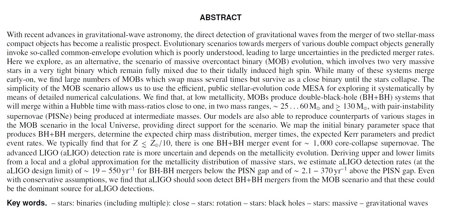 Although there is some technical jargon, the point is relatively clear. It appears that very masssive, very low metallicity binary stars can evolve into black hole binary systems via supernova explosions without disrupting their orbit. The term ‘low metallicity’ characteristises stars that form from primordial material (i.e. basically hydrogen and helium) early in the cycle of stellar evolution. Such material has very different opacity properties from material with significant quantities of heavier elements in it, which alters the dynamical evolution considerably.