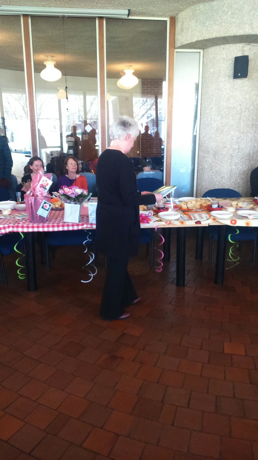 P.P.S. I only had time to take one picture, but here is Sally opening some of her gifts among the remains of the cakes and scones…