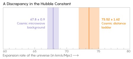 A chart showing the two differing results for the Hubble constant – The expansion rate of the universe (in km/s/Mpc)