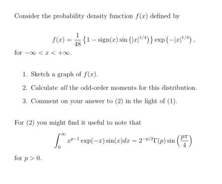 SOLUTION: I’ll leave you to draw your own sketch but, as Anton correctly points out, this is a distribution that is asymmetric about its mean but has all odd-order moments equal (including the skewness) equal to zero. it therefore provides a counter-example to common assertions, e.g. that asymmetric distributions must have non-zero skewness. The function shown in the problem was originally given by Stieltjes, but a general discussion can be be found in E. Churchill (1946) Information given by odd moments, Ann. Math. Statist. 17, 244-6. The paper is available online here.