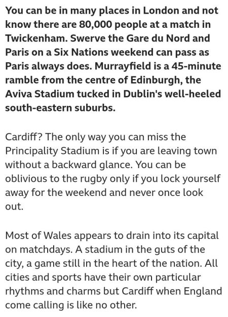 Today is of course the occasion for the Wales versus England match in this year’s Six Nations Rugby tournament. This excerpt from a piece by Tom Fordyce on the BBC website is spot on: