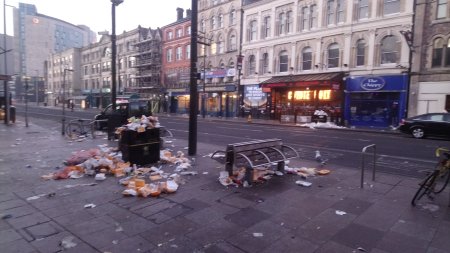 On the way to the bus stop in the City Centre I had to pick my way through the mess created by yesterday’s rugby crowd: empty beer bottles, plastic glasses and fast food containers lay all around, the pavements were sticky with spilt booze and massed formations of seagulls wheeled and shrieked looking for leftovers to scavenge.