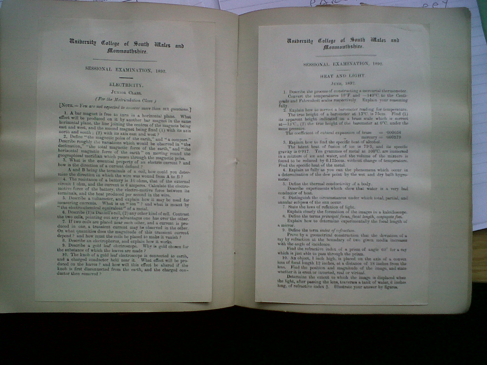 Anyway, all this reminded me that many years ago when at Cardiff there came into my possession a book of very old school and university physics examinations, which are of interest because I’ve been posting slightly less ancient examples in recent weeks. These examinations were set by the University College of South Wales and Monmouthshire, which was founded in 1883,  an institution which eventually became Cardiff University. I find them absolutely fascinating.