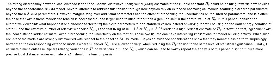 The Vagnozzi paper represents a statement of this in the context of the Hubble tension. If a new floating parameter w is introduced the data prefer a value less than -1 (as demonstrated in the figure) but on posterior probability grounds the resulting model is less probable than the standard cosmology for the reason stated above. Vagnozzi then argues that if a new fixed value of, say, w = -1.3 is introduced then the resulting model is not penalized by having to spread the prior probability out over a range of values but puts all its prior eggs in one basket labelled w = -1.3.