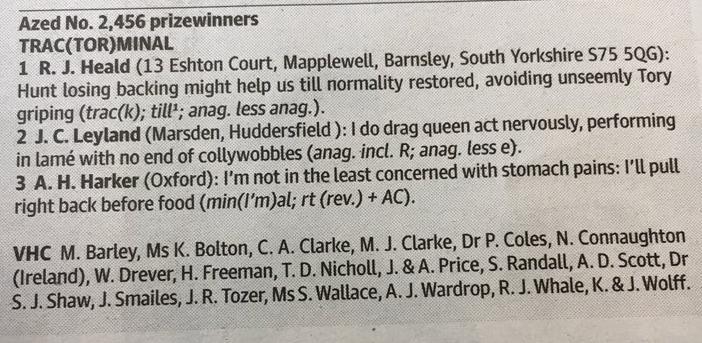 You can find the (far better) prize-winning clues here. There’s no actual prize for a VHC – except for a warm glow of satisfaction – but y effort was at least deemed good enough to get my name in this week’s Observer: