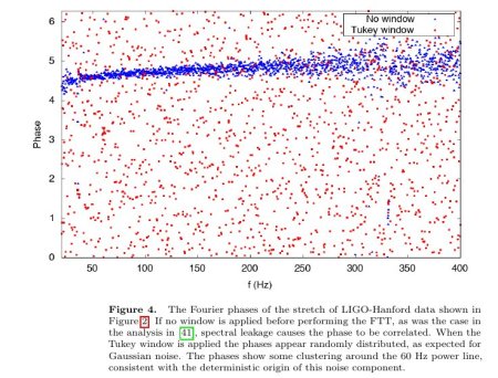 As I have mentioned before on this blog, the human eye is very poor at distinguishing pattern from randomness. There are some subtleties involved in testing for correlated phases (e.g. because they are periodic) but there are various techniques available: I’ve worked on this myself (see, e.g., here and here.). The phases shown may well be consistent with a uniform random distribution, but I’m surprised the LIGO authors didn’t present a proper statistical analysis of the windowed phases to prove beyond doubt the point they seem to be trying to make.