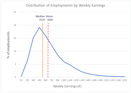 It’s worth pointing out that in Ireland (as practically everywhere else) the distribution of earnings is very skewed. here is an example showing weekly earnings in Ireland a few years ago to demonstrate the point.