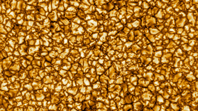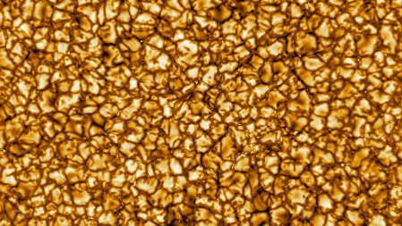 In the above image you can see the granular structure of the Sun’s photosphere. The cells you can see are a manifestation of the large-scale convective motions that transport energy from the Sun’s inner regions to the surface. This energy is created by nuclear reactions in the solar core and it sets up convective motions in the outer layers rather like those in a pan of boiling water set up by heating from below (or perhaps the gentler motions that appearin a lava lamp).