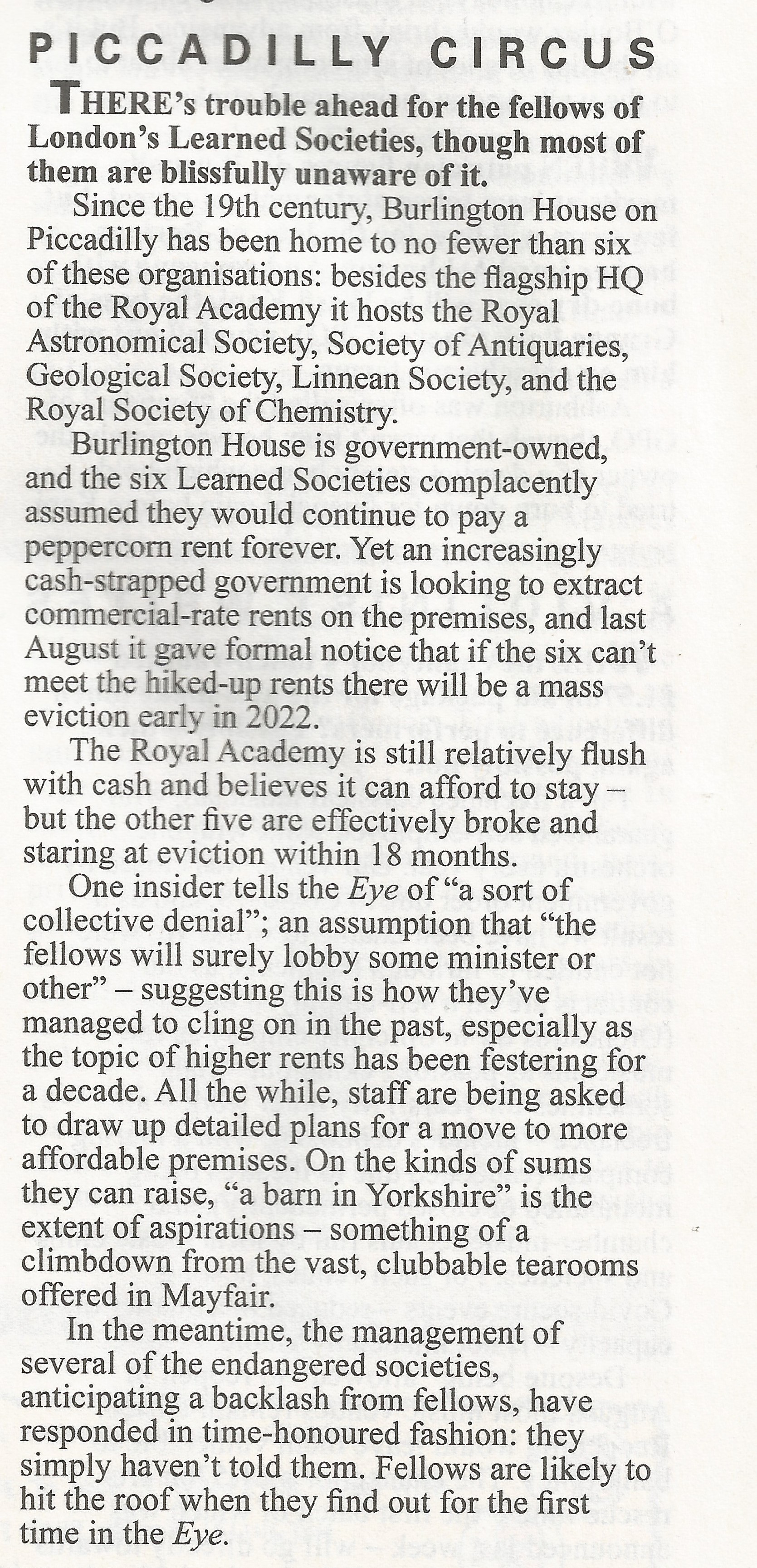 It sounds rather alarming for the Royal Astronomical Society, which is currently accommodated in Burlington House in Piccadilly, but I do remember something similar being in the air not too long ago when I was a Member of RAS Council. The Government of the time threatened to increased rents and everyone involved with the RAS, including its Fellows, was a bit worried but an agreement was struck. Presumably now the leases are up for negotiation again?