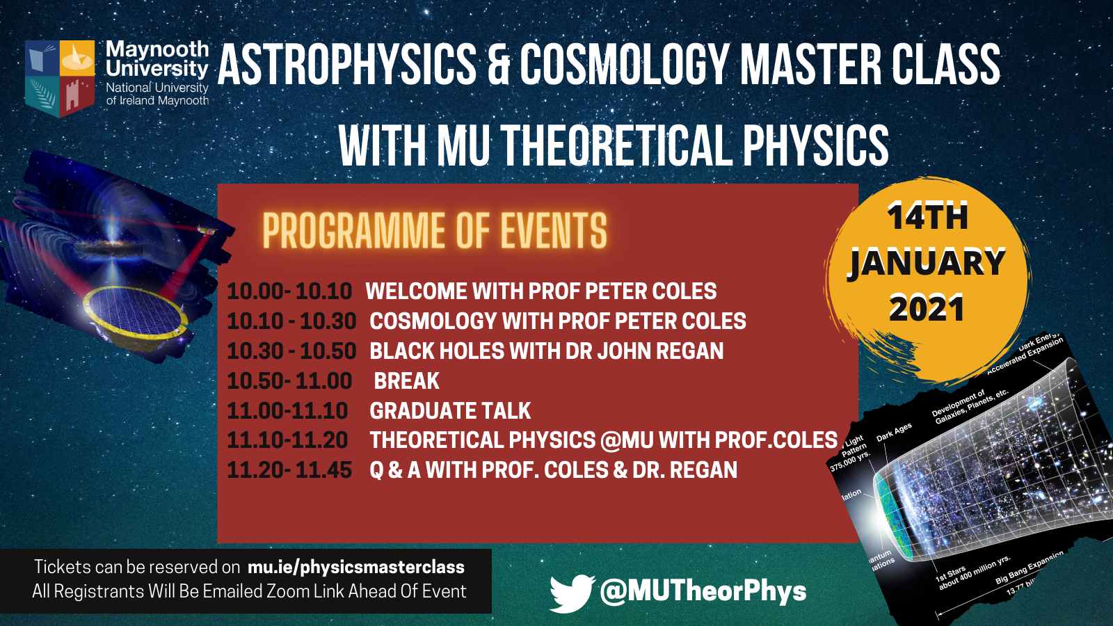 I’ll be talking about cosmology early on, while John Regan will talk about black holes. After the coffee break one of our PhD students will talk about why they wanted to study astrophysics. Then I’ll say something about our degree programmes for those students who might be interested in studying astrophysics and/or cosmology as part of a science course. We’ll finish with questions either about the science or the study!
