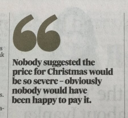 But back to Mr Leahy. The statement that “nobody suggested the price for Christmas would be so severe” is plainly untrue: plenty of people knew exactly what was coming and said so loudly and publicly. Neither he nor the politicians listened. If there’s any justice the “political fallout” from this catastrophic weakness will be severe.