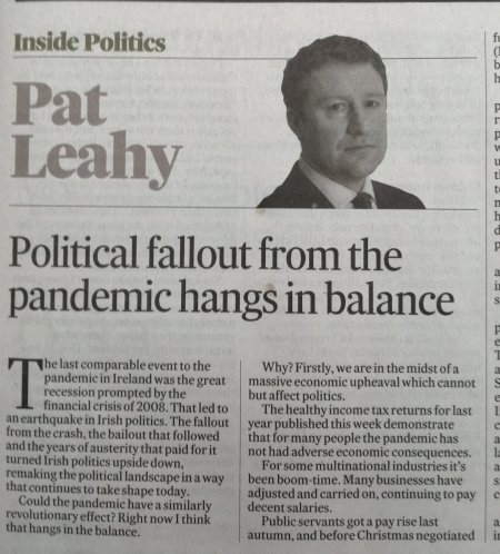 It’s bad enough that he writes as if the most important thing about the pandemic is not that people are dying but that there might be implications for Ireland’s political establishment. And that he takes the opportunity to take churlish swipes like “Many public servants have, of course, been working furiously hard. Some haven’t.” As a public servant who has put in countless hours of unpaid overtime over the past year that snide comment really got my goat, coming as it does from a Political Editor who trots out lazy evidence-free rubbish for a living.