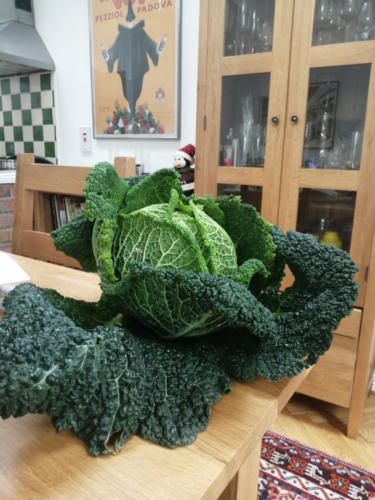 As it happens Thursday is also the day of my newly organized veggie box delivery, so here’s a picture of the enormous Savoy cabbage that arrived this morning (along with various other items such as leeks, rainbow chard and beetroot):