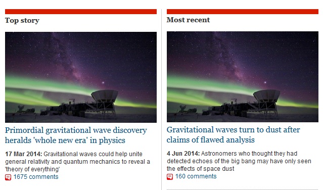 During March 2014 this blog received the most traffic it has ever had (reaching almost 10,000 hits per day at one point). The reason for that was the announcement of the “discovery” of primordial gravitational waves by the BICEP2 experiment. Despite all the hype at the time I wasn’t convinced. This is what I said in an interview with Physics World: