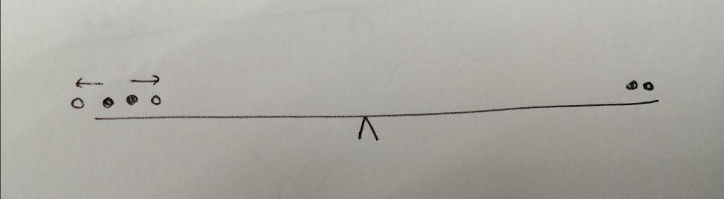 Four identical masses are placed at rest in pairs either side of an extremely sensitive balance in a symmetrical way such that the distance between the members of a pair is identical for each pair and the centre of mass of each pair is equally spaced from the fulcrum of the balance. In this configuration the system is in equilibrium and the balance is level.