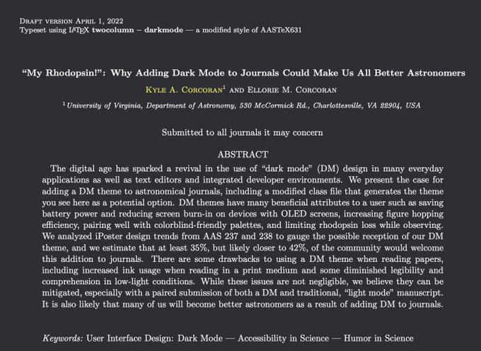 One of the many spoof posts that appeared on arXiv on April Fool’s Day was one about Dark Mode: