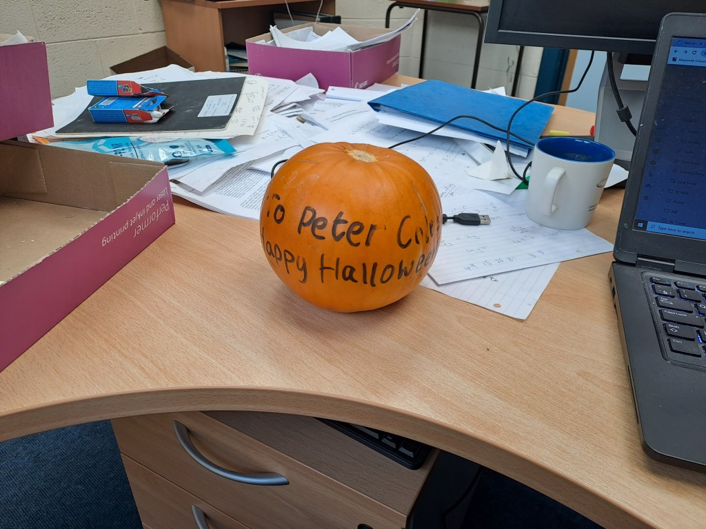 Yesterday my Vector Calculus students gave me the above Hallowe’en gift, which was nice of them, although I did chastise them for missing the apostrophe. Of course Hallowe’en itself is not until Monday, but that is a Bank Holiday in Ireland and the rest of next week is Study Week so there are no lectures or tutorials.