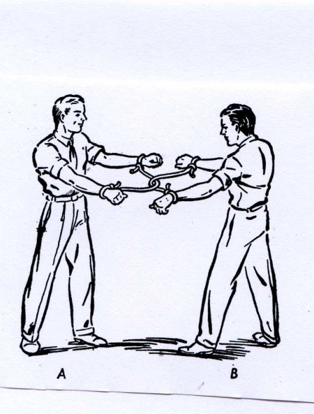 It’s probably best not to ask why, but the two gentlemen in the picture, A and B, are tied together in the following way: one end of a piece of rope is tied about A’s right wrist, the other about his left wrist. A second rope is passed around the first and its ends are tied to B’s wrists.