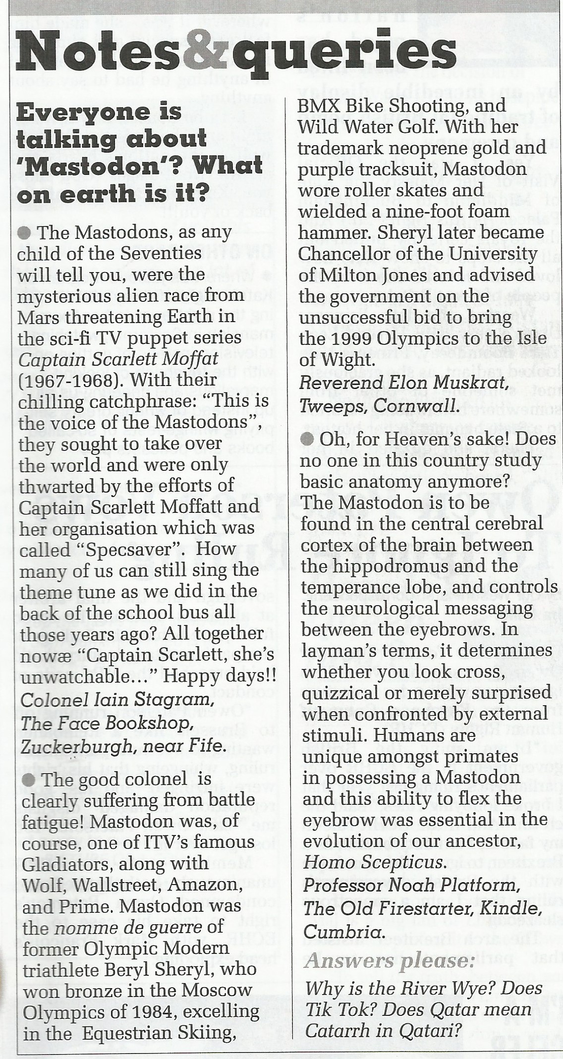 I know quite a few people these days are asking what Mastodon is. Fortunately, I see in the latest Private Eye that some leading experts have given their opinion on the matter: