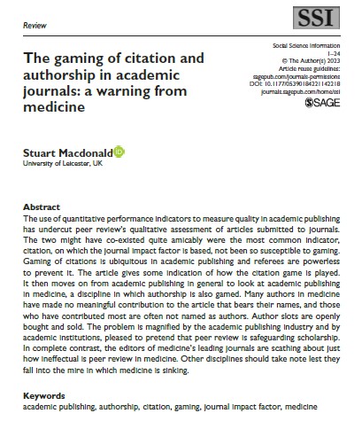 The paper does not just discuss authorship, but also citations. I won’t discuss the Journal Impact Factor further, as any sane person knows that it is daft. Citations are not just used to determine the JIF, however – citations at article level make more sense, but are also not immune from gaming, and although they undoubtedly contain some information, they do not tell the whole story. Nor will I discuss the alleged ineffectiveness of peer review in medicine (about which I know nothing). I will however end with one further quote from the abstract: