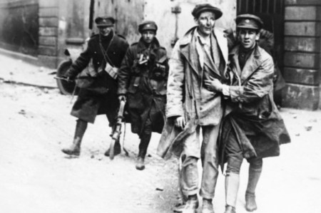 An injured Anti-Treaty soldier is supported by a fellow fighter in the Battle for Dublin that started the Irish Civil War; over 500 Anti-Treaty fighters were taken as prisoners after the battle died down in the city.