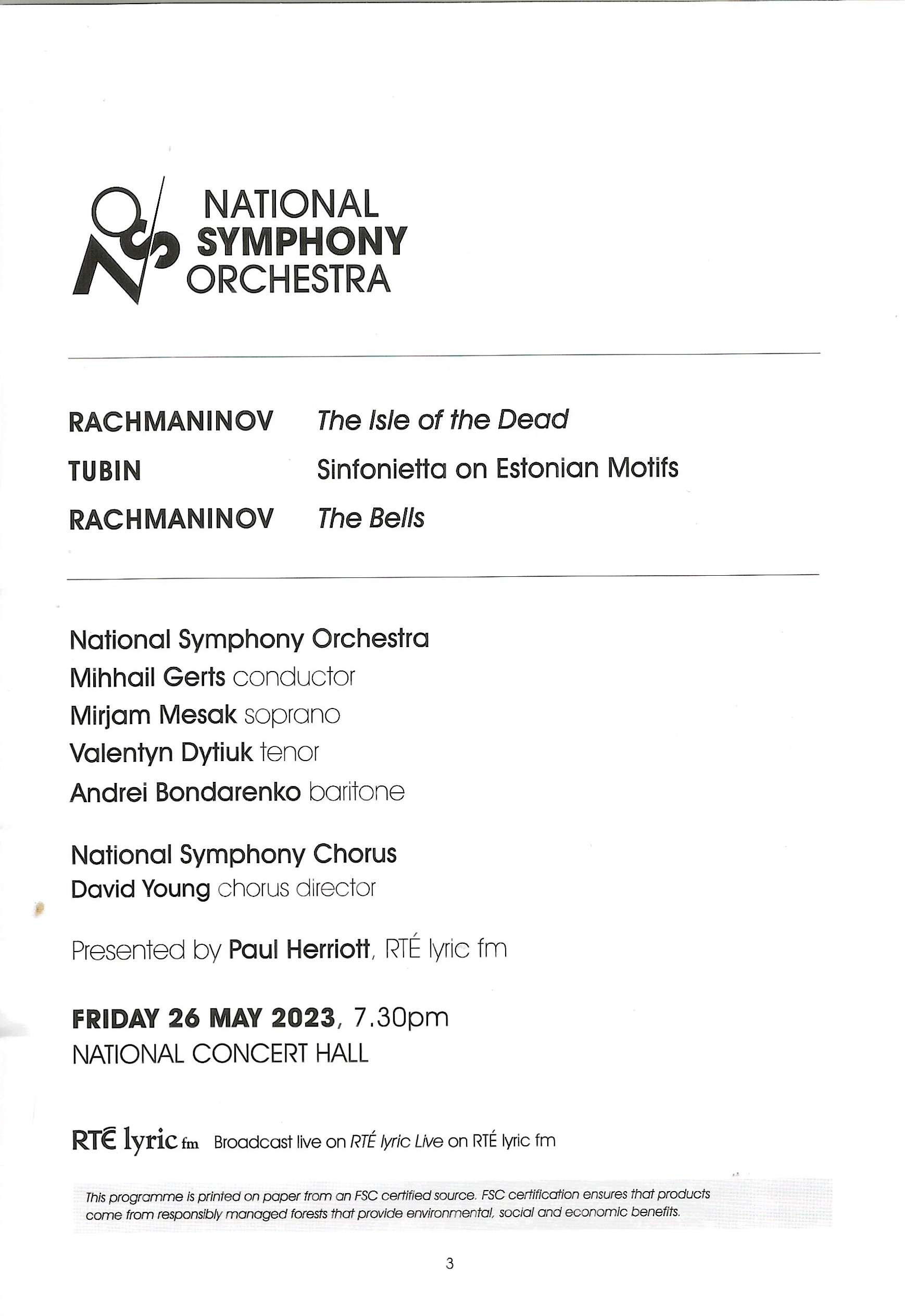 Yesterday, after a nice walk through the sunny streets of Dublin, at the National Concert Hall for the final concert of the season by the National Symphony Orchestra, under the direction of Mihhail Gerts, who were joined, for the second half, by the National Symphony Chorus directed by David Young and three star vocalists. The progamme consisted of two pieces by Sergei Rachmaninov (who was born 150 years ago this year) and one by Eduard Tubin (an Estonian composer who was new to me before last night).