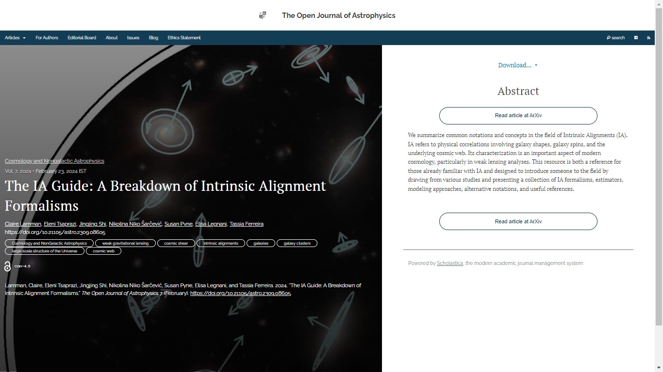 The second paper was published on Friday 23rd February and has the title “The IA Guide: A Breakdown of Intrinsic Alignment Formalisms” and the authors are: Claire Lamman (Harvard, USA); Eleni Tsaprazi (Stockholm, Sweden); Jingjing Shi (Tokyo, Japan); Nikolina Niko Šarčević (Newcastle, UK); Susan Pyne (UCL, UK); Elisa Legnani (Barcelona, Spain); and Tassia Ferreira (Oxford, UK). This one, which is in the folder marked Cosmology and NonGalactic Astrophysics, presents a review of Intrinsic Alignments, i.e. physical correlations involving galaxy shapes, galaxy spins, and larger scale structure, especially important for weak gravitational lensing