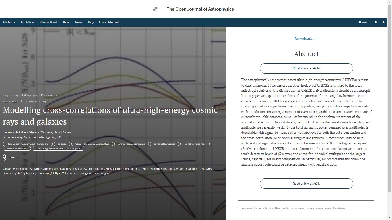The first paper of the most recent pair – published on Thursday 22nd February – is “Modelling cross-correlations of ultra-high-energy cosmic rays and galaxies” by Federico Urban (Prague, Czech Republic), Stefano Camera (Torino, Italy) and David Alonso (Oxford, UK). It presents a discussion of the possible statistical correlations between Ultra-High-Energy Cosmic-Ray (UHECR) directions in various models and structure in the galaxy distribution and whether or not this signal could be measurable. This one is in the folder marked “High-Energy Astrophysical Phenomena“.