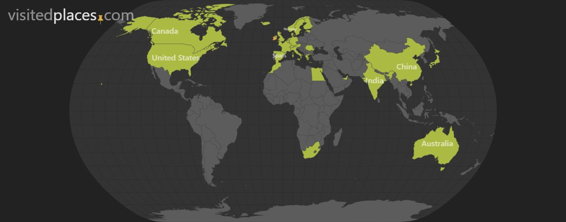 As I sit in an airport waiting for yet another flight I played around with a website that makes a map with countries that you have visited marked on it. Mine looks now like this:
